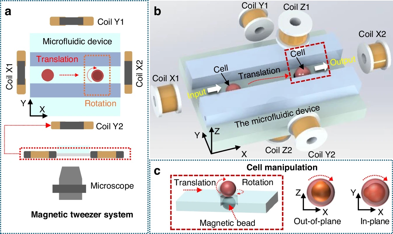 “a Two-dimensional magnetic tweezers system based on a microfluidic device under a microscope. b Three-dimensional magnetic tweezers system, including four magnetic coils in the X-Y plane and two vertical coils in the Z direction. Cell transportation and reorientation. c Schematic diagram of cell rotation outside the plane and rotation within the plane. In (b, c), the red box region corresponds to the area where the magnetic beads are located directly beneath the cell” Reproduced from Guo, X., Wang, F., Zhao, A. et al. Design of an automated cell batch microinjection system based on magnetic tweezers for zebrafish embryos. Microsyst Nanoeng 12, 113 (2026). https://doi.org/10.1038/s41378-026-01230-3 under a Creative Commons Attribution 4.0 International License.